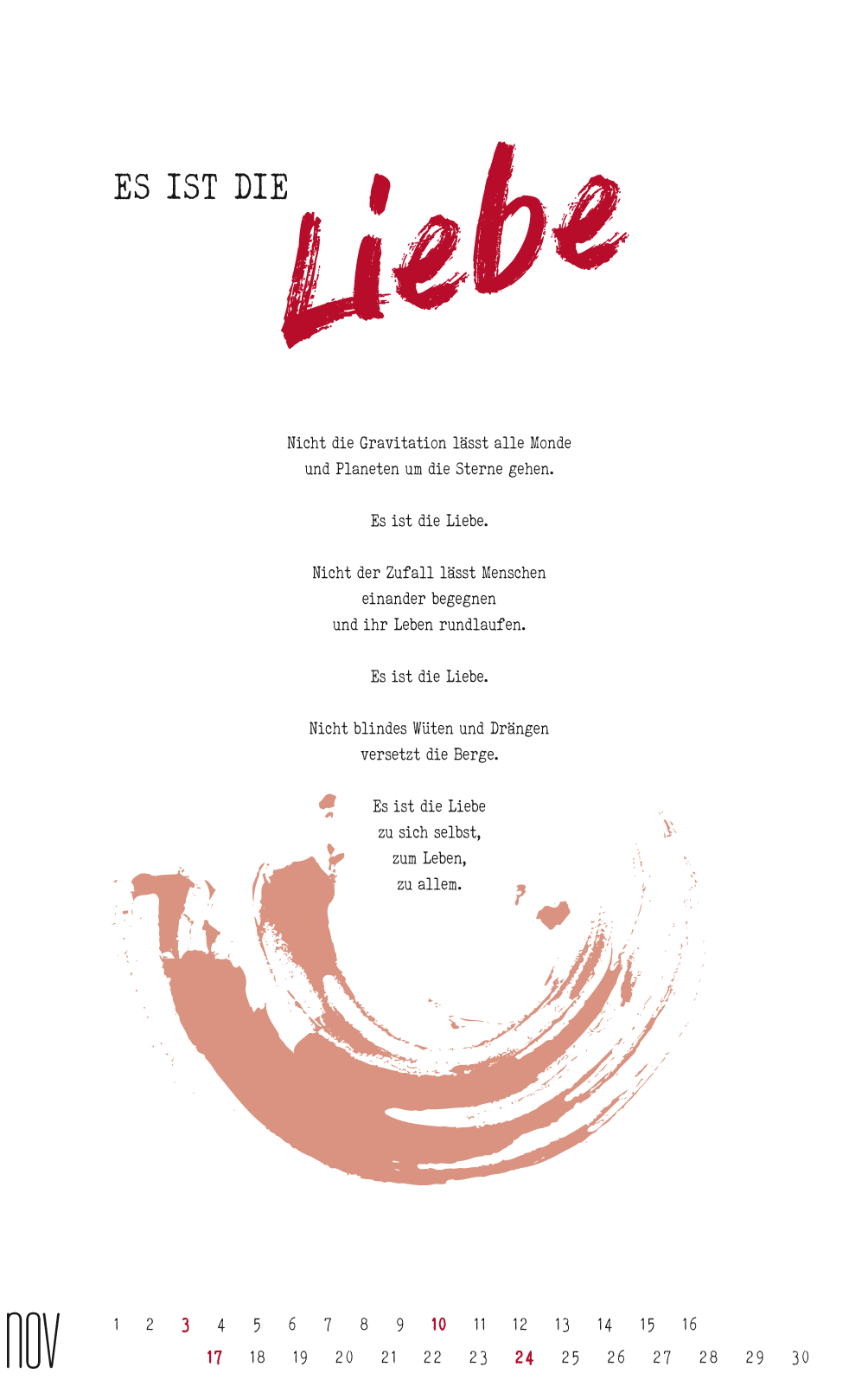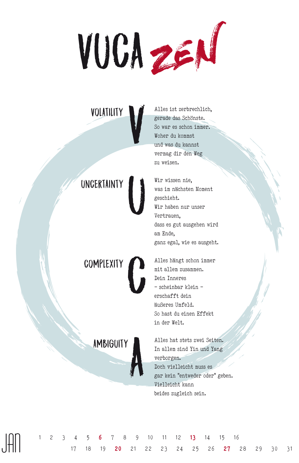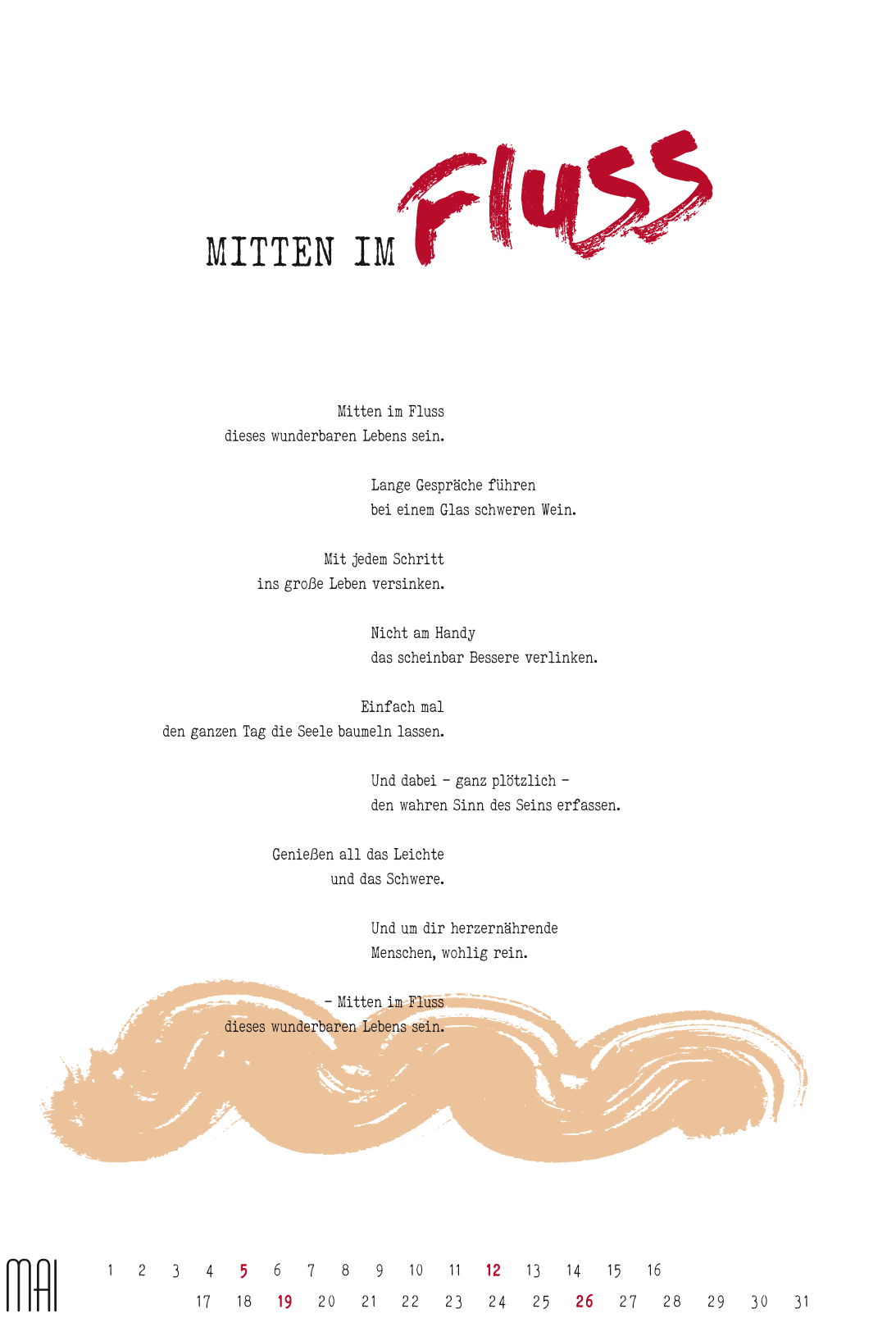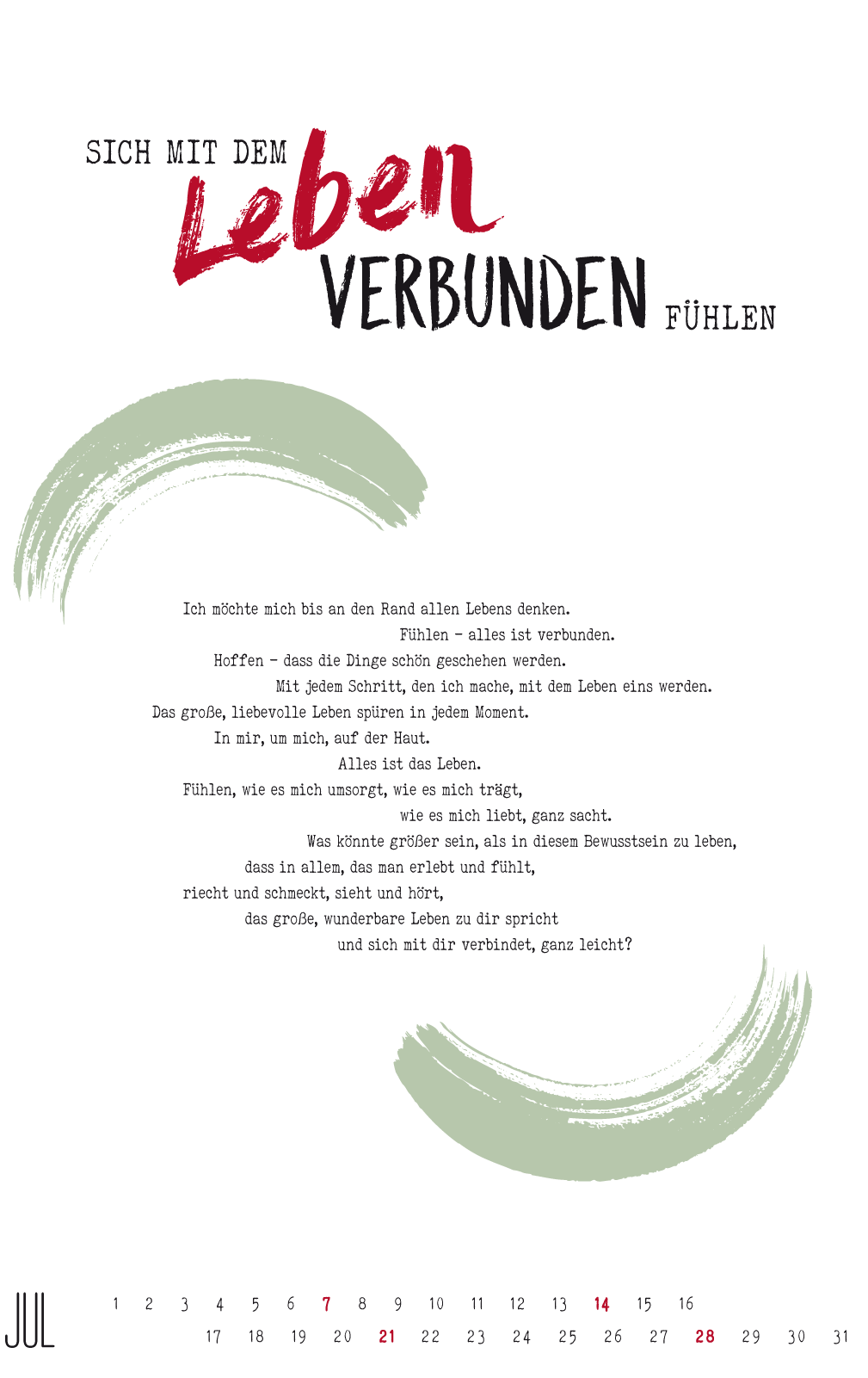 Eigene Zen-Gedanken in schöner Gedichtform, hochwertig von einer Grafikerin gestaltet in DIN A2, auf dickem Papier, mit neutralem Kalender, um sich jedes Jahr aufs Neue daran zu freuen.